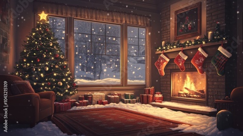 A cozy living room with stockings hung by the fireplace, a Christmas tree glowing in the corner, and a warm fire crackling as snow falls softly outside the window