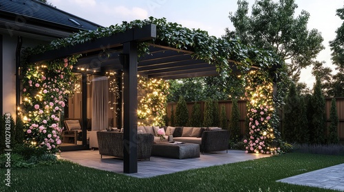 A cozy outdoor patio adorned with glowing lights and lush greenery, perfect for relaxation and evening gatherings.