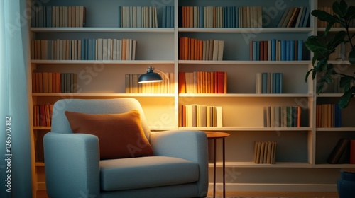 A cozy reading nook featuring a comfortable chair, warm lighting, and a bookshelf filled with colorful books, creating an inviting atmosphere for relaxation.
