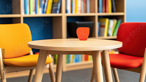A cozy reading nook featuring a wooden table with an orange object and colorful chairs, set against a backdrop of bookshelves.