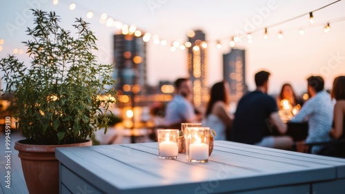 A cozy rooftop setting with candles and plants, perfect for social gatherings during sunset, creating an inviting atmosphere.