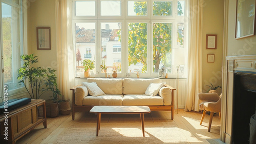 A cozy Scandinavian living room featuring minimalistic design with light wood furniture, soft pastel colors, and large windows that fill the space with natural light.