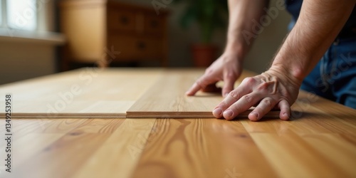A Craftsperson Carefully Aligns Light Wood Sheets on a Table for a Construction Project