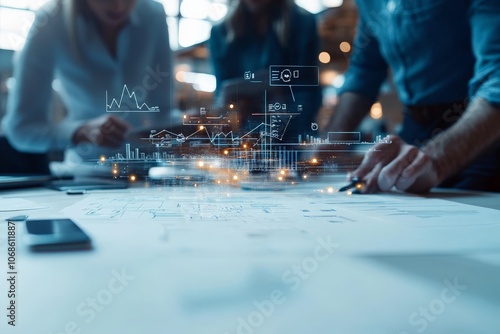 A creative team collaborates over a digital interface with futuristic graphs and diagrams, illustrating teamwork and innovation in technology-driven projects.