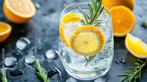 A crisp gin and tonic with citrus slices and rosemary sprigs, beautifully served in a chilled glass.