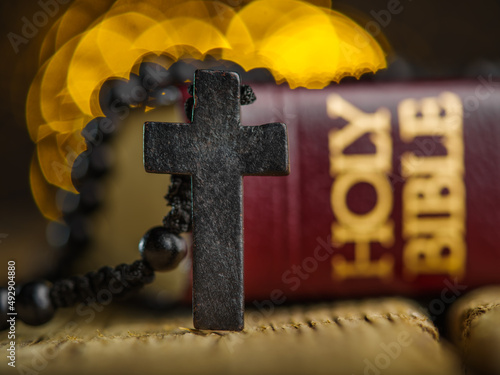 A cross and a rosary against the background of a holy bible on a wooden table in a church with lights from the light.The concept of prayer and faith in God.Religion and church
