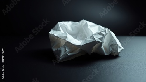 A crumpled piece of white paper rests on a dark surface, illuminated by a single, focused light source, casting sharp shadows and highlighting the intricate folds and creases.