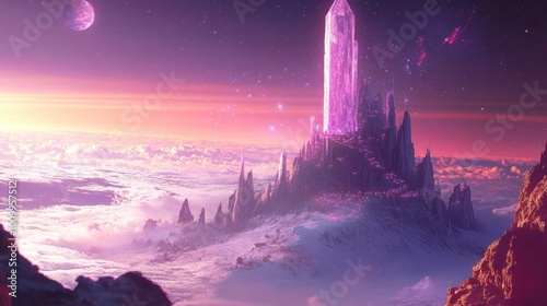 crystal, church steeple, city, rise, purple, cloud, star, sky, mountain, rock, fantasy, landscape, scenic, majestic, aethereal, magical, mystical, glow, light, bright, pink, orange, red, night, dawn, sunset, horizon, distant, abstract, artistic, illustration, digital, artwork, concept, imagination, dream, surreal, wonder, awe