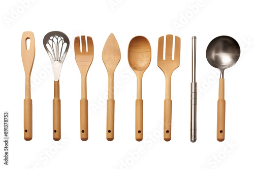 A Culinary Ensemble of Wooden and Stainless Steel Utensils on a Clear PNG or White Background.