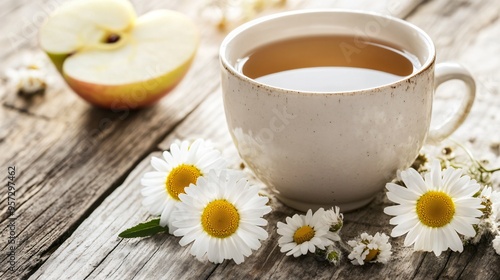 A cup of chamomile tea, with a few fresh daisies and a slice of apple beside the cup on a wooden table