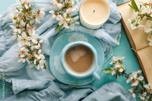 hot drink, cup, blue, topview, foam, blossom, flower, spring, cosy, peaceful, serene, morning, drink, beverage, reading, relaxation, calm, floral, latte, nature, flower petals, bloom, refreshing, aroma, hand-made, ceramic, saucer, natural, white, tranquil, warm, elegant, lifestyle, background, composition, banner, wallpaper, atmosphere, aesthetic, picture, beautiful, inspiration, mood, vibe, literature, solitude, peace, book