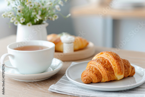 A cup of herbal tea and croissant on table at hotel restaurant cafe