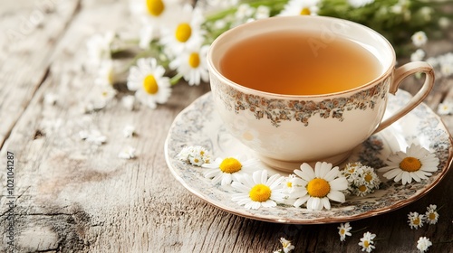 A cup of herbal tea with chamomile flowers on the saucer, sitting in an elegant teacup