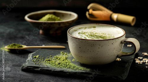 a cup of matcha green tea, with a traditional bamboo whisk and a bowl of matcha powder in the background, set on a dark slate surface