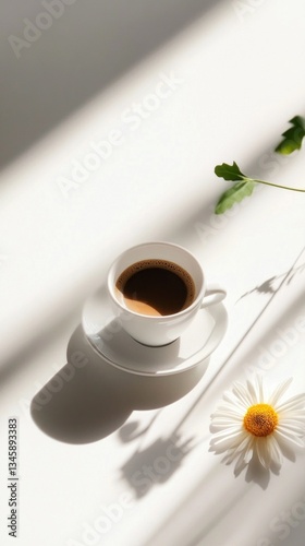 A cup of rich coffee sits on a bright table, sunlight streaming through, creating soft shadows. A fresh flower and green leaves add a touch of nature's beauty to the moment