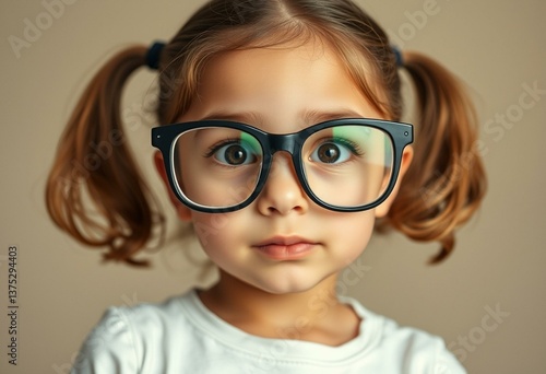 A curious 7-year-old girl looking through oversized glasses