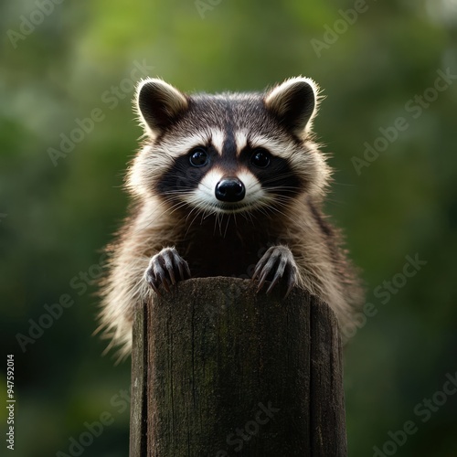 A curious raccoon peeking over a wooden post, showcasing its playful and inquisitive nature in a lush green environment.