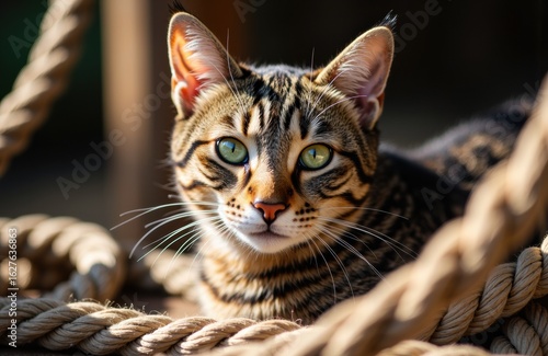 A curious tabby cat with striking green eyes resting on a woven rope surface
