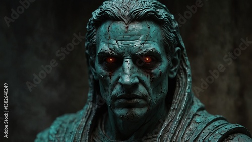 A cursed statue of Hemoran, his body corroded into verdigris, his eyes weeping dark crimson tears of malediction