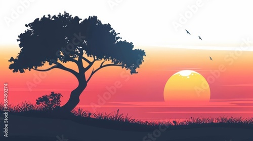 A cute cartoon Style ofA serene sunset with a minimalistic silhouette of a tree