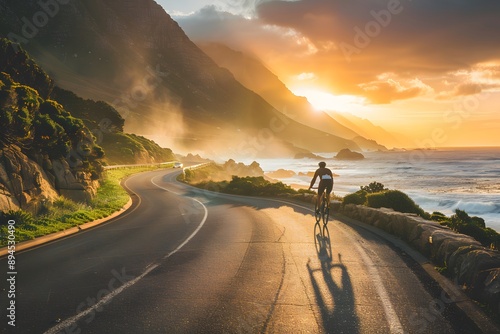 A cyclist riding along a coastal road at sunset, adventure travel, scenic view