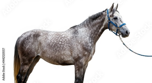 horse, dappled, grey, profile, halter, blue, rope, white, animal, equine, mammal, fast horse, mare, farm, field, tail, head, neck, leg, isolated, background, domestic, pet, equestrian, breed, coat, mane, eye, ear, chain