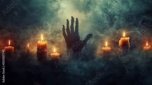 A dark, atmospheric scene featuring a ghostly hand emerging from mist, surrounded by flickering candles.