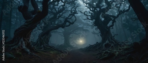 A dark, eerie forest with twisted, gnarled trees, thick mist, and faint beams of moonlight breaking through the shadows