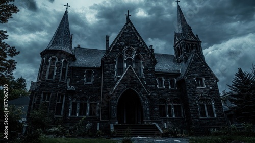 A dark, gothic-style church with tall spires under a moody, cloudy sky.