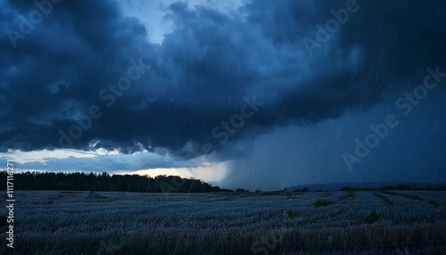 A dark, moody evening sky in shades of black and blue, with dramatic clouds creating a foreboding atmosphere. The scene captures the eerie stillness before a storm, evoking a sense of tension.