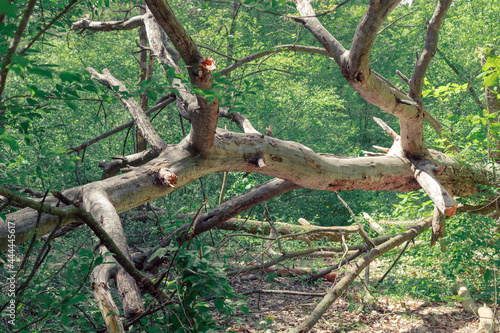 A dead dry tree with twisted branches lies in the forest. Fallen dry tree in the forest