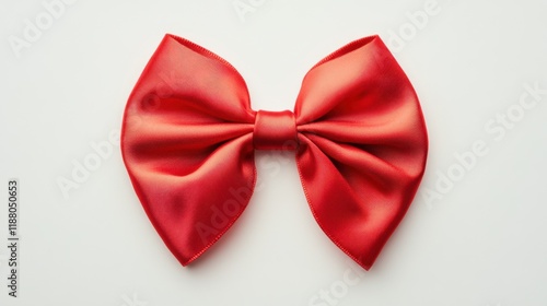 A decorative red satin ribbon bow with vibrant color and a shiny texture, placed flat on a clean white background.