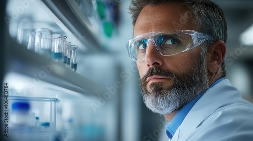 A dedicated scientist wearing safety goggles analyzes various samples stored in glass containers while engaged in important laboratory research and experimentation