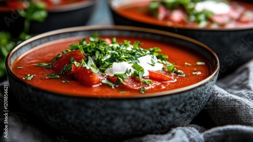 A deep bowl of vibrant red soup topped with a dollop of cream and garnished with freshly chopped parsley, creating a vibrant and appetizing presentation.