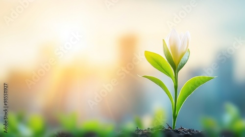 A delicate flower emerges from the soil, symbolizing hope and renewal against a vibrant city backdrop at sunrise.