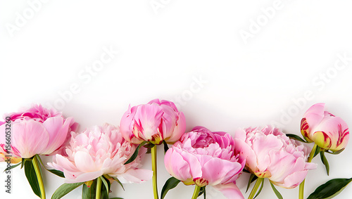A Delicate Garland of Soft Pink Peony Blossoms Adorned with Green Leaves Against a Clean White Background Ideal for Spring Celebrations and Floral Arrangements
