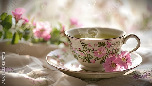 teacup, floral, delicate, green, tea, steam, morning, serene, elegant, vintage, porcelain, intricate, soft light, feminine, decorative, comfort, warmth, cosy, tranquil, lace, relaxing, peaceful, drink, hot beverage, detailed, aesthetic, traditional, ornate, beautiful, calming