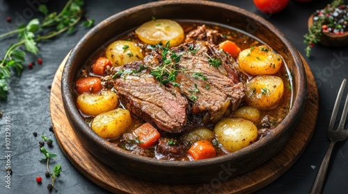A delicious beef stew with potatoes and carrots served in a terracotta bowl on a table with herbs and spices around
