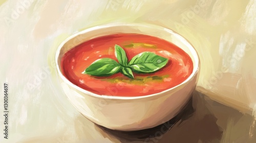 gazpacho, soup, tomatoes, basil, food, cookery, culinary, dish, meal, receipe, delicious, tasty, appetising, summer, refreshing, healthy, vegetarian, vegan, spanish, mediterranean, bowl, red, green, oil, vegetable, sauce, lunch, dinner, eating, taste, favor, comfort, simple, fresh, art, painting, illustration, digital, artistic