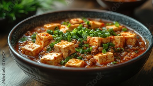 tofu, cube, bowl, sauce, spicey, red, green, onion, food, cookery, delicious, savoury, meal, lunch, dinner, vegetable, ingredient, cooking, culinary, close, up, macro, fresh, flavorful, appetising, aromatic, tasty, healthy, vegetarian, vegan, protein, side, dish, serving, garnish, texture, detail, hearty, traditional, ground, meat, grain, seed, warm, rich, broth