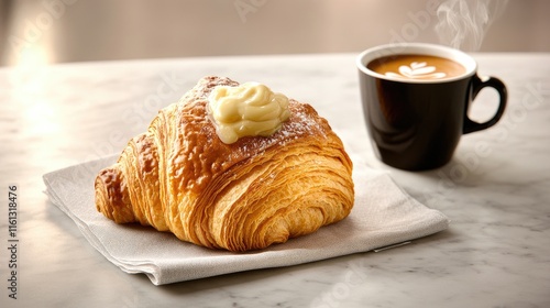 A delicious croissant with cream and a steaming cup of coffee on a marble surface.