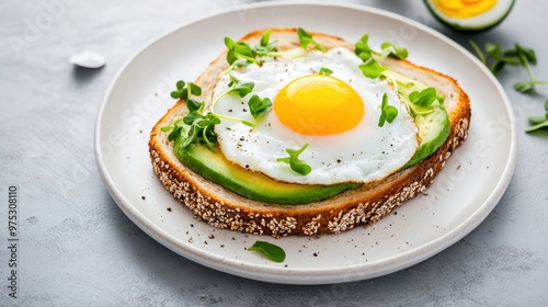 A delicious slice of toast topped with avocado, a sunny-side-up egg, and fresh greens, perfect for a healthy breakfast.
