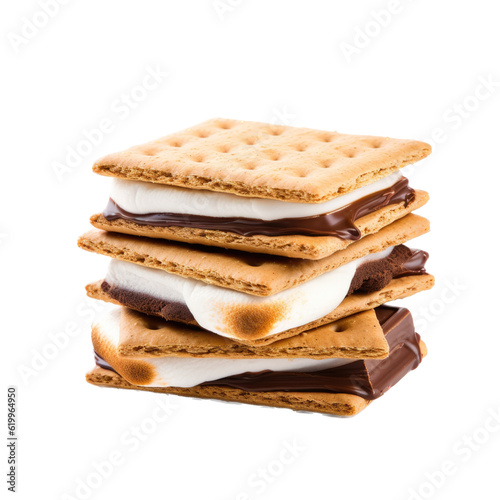 a delicious Smore with melted Chocolate crunchy Graham Cracker and a gooey Marshmellow, camping, isolated, Food-themed, photorealistic illustrations in a PNG, cutout, and isolated. Generative AI