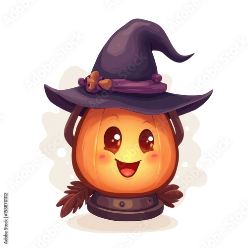 A delightful cartoon pumpkin wearing a witch hat radiates Halloween cheer with its charming smile and glowing light.