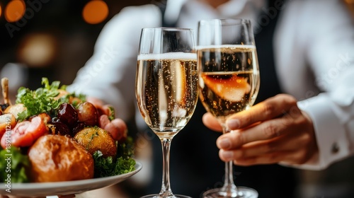 A delightful celebration scene featuring sparkling drinks toasting over a vibrant plate of gourmet food, symbolizing enjoyment, togetherness, and the joy of fine dining experiences.