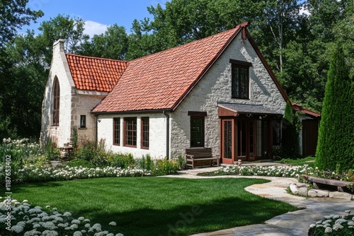 bungalow, stone, house, garden, flower, greenery, sunny, day, blue, sky, landscape, architecture, rural, home, pathway, peaceful, residential, nature, vegetation, calmness, charming, scenic, inviting, idylli, woodwork, design, exterior, backyard, relaxation, sunlight, horizon, flower, bed, shrubbery, tree, cosy, serene, picturesque, bright, building, grass, roof, country, old, village, tree, lawn, window