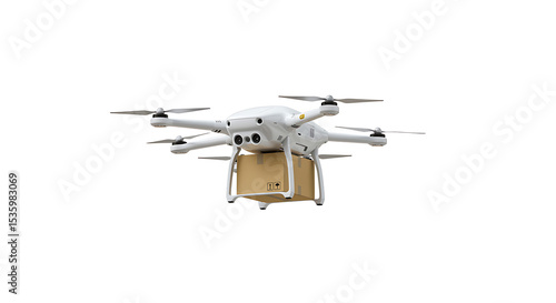A delivery drone or quadcopter carrying a cardboard package, isolated on a white background. Concept of future logistics, autonomous shipping, and e-commerce.