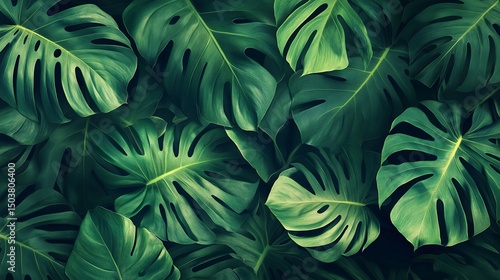 A dense arrangement of vibrant green monstera leaves filling the frame with a tropical aesthetic look