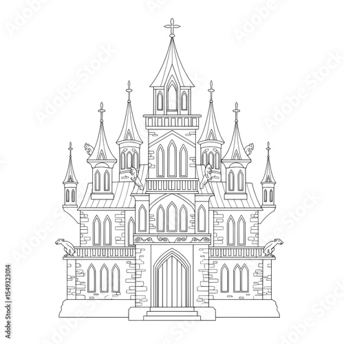 castle, gothic, architecture, building, church steeple, tower, fantasy, structure, fortress, design, vignetting, drawing, illustration, outline, monochrome, black, white, isolated, pattern, roof, window, arch, stone, brick, detail, mediaeval, fairy tale, classic, vintage, ornate, decoration, art, vector, religious, cross, elegant, historical building, gargoyle, sculpture, european, heritage, style, mysterious, royalty