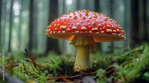 A detailed close-up of a red mushroom with dew droplets clinging to its cap